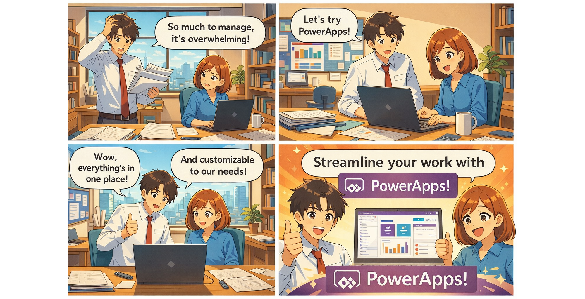 PowerApps のcustamizeを業務受託するという広告を漫画で作成 2000×1040 p