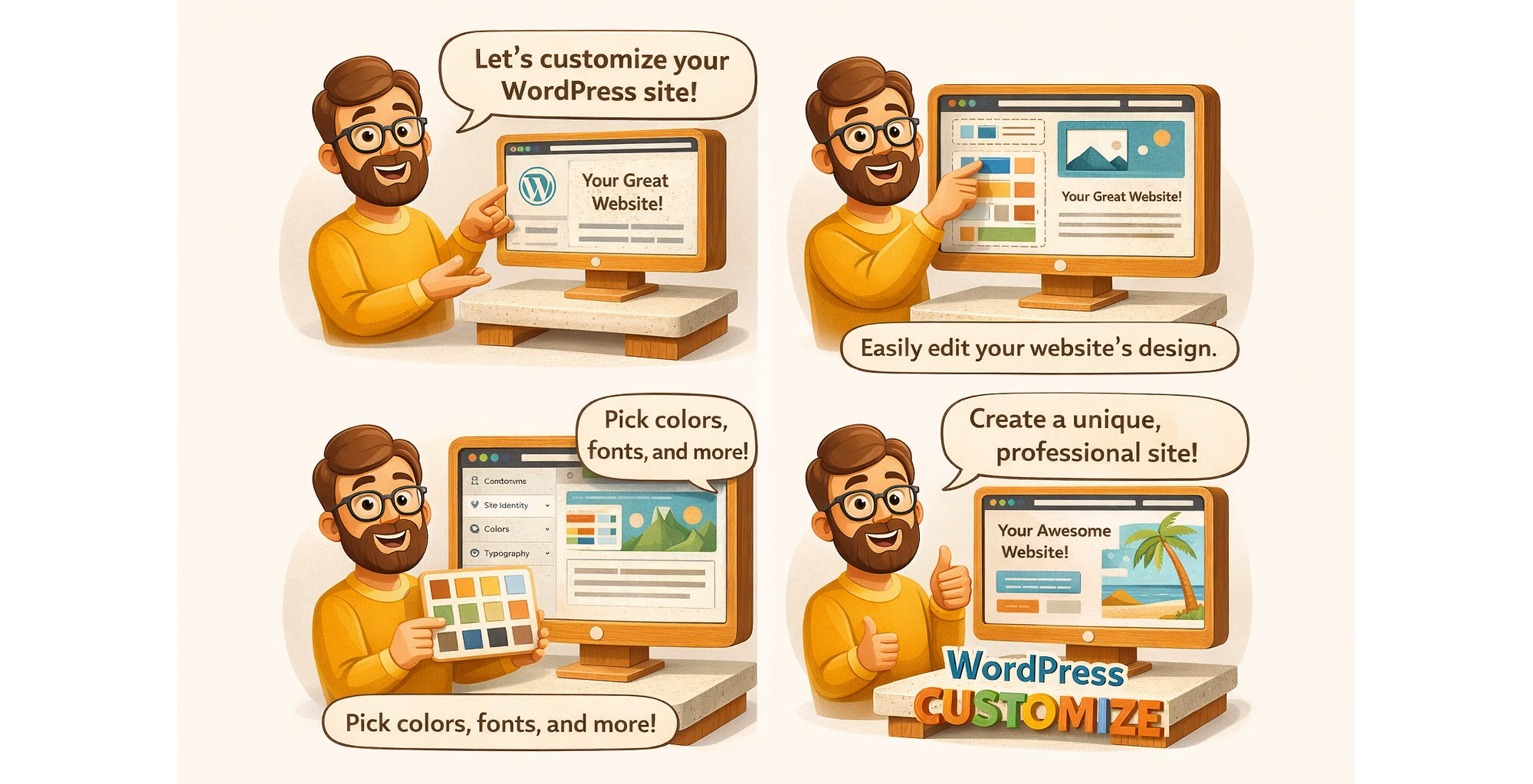 wordpress のcustamizeを業務受託するという広告を漫画で作成 2000×1040 p